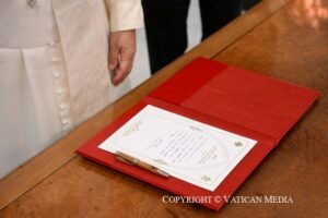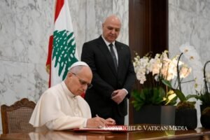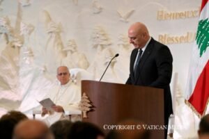 وختم الرئيس عون كلمته بالقول :”صاحب القداسة، أبلغوا العالم عنا، بأننا لن نموت ولن نرحل ولن نيأس ولن نستسلم. بل سنظل هنا، نستنشق الحرية، ونخترع الفرح ونحترف المحبة، ونعشق الابتكار، وننشد الحداثة، ونجترح كل يوم حياة أوفر”.