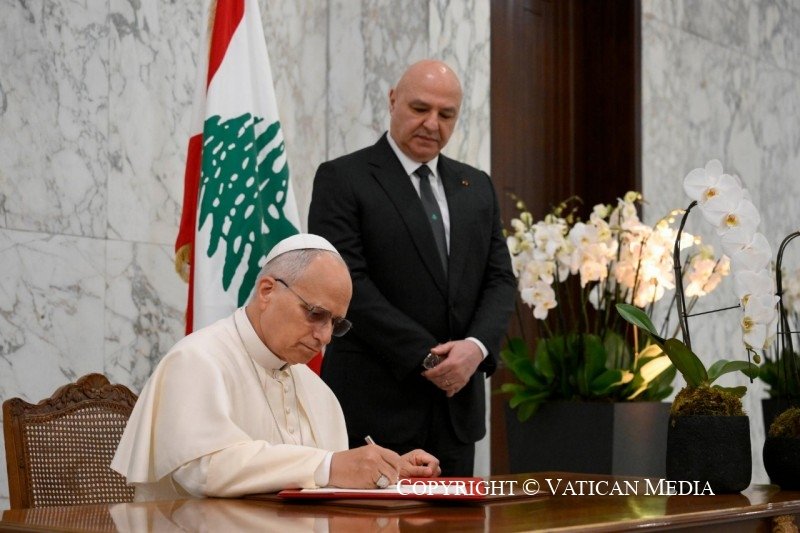 ثم انتقل البابا لاون والرئيس عون واللبنانية الاولى الى البهو الرئيسي للقصر حيث دون قداسته بقلم مصنوع من خشب الزيتون على يد حرفي لبناني، على السجل الذهبي الكلمة الاتية: