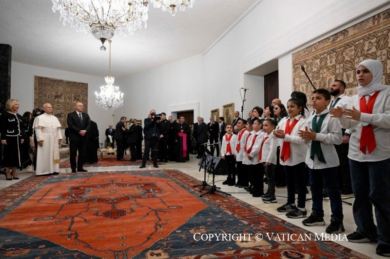 أختتم وأستلهم صفة أخرى ثمينة من تقليدكم العريق. أنتم شعب يحبّ الموسيقى، التي تتحوّل في أيّام الاحتفال إلى رقص ولغة للفرح والتّواصل. هذا الجانب من ثقافتكم يساعدنا لنفهم أنّ السّلام ليس مجرّد نتيجة جَهد بشريّ، مهما كان ضروريًّا، بل هو عطيّة من الله، تسكن أوّلًا قلوبنا. إنّه مثل حركة داخليّة تتدفّق إلى الخارج، تؤهِّلنا لأن نهتدي بأنغام تفوقنا، هي نغم المحبّة الإلهيّة. من يرقص يتقدّم بخطواتٍ خفيفة، من دون أن يدوس الأرض، ويجعل انسجامًا بين خطواته وخطوات الآخرين. هكذا هو السّلام: طريق يحرّكه الرّوح القدس، الذي يضع القلب في حالة إصغاء ويزيد انتباهه واحترامه للآخرين. لَيت هذا الشّوق إلى السّلام ينمو بينكم، الشّوق الذي ينبع من الله ويستطيع أن يغيِّر منذ اليوم طريقة نظركم إلى الآخرين، فتسكنوا معًا هذه الأرض، الأرض التي يحبّها الله حبًّا عميقًا ويستمرّ في مباركتها.