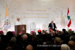 من جهته، اكد قداسة البابا في كلمة له على مفهوم صناعة السلام، فاشار فيها بداية إلى أن اللبنانيين هم “شعب لا يستسلم، بل يقف أمام الصّعاب ويعرف دائمًا أن يُولَد من جديد بشجاعة”، معتبراً أن صمودهم هو علامة مميّزة لا يمكن الاستغناء عنها لفاعلي السّلام الحقيقيّين.