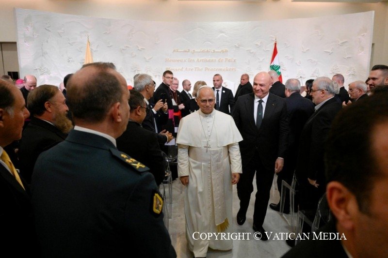 إنّه لفرحٌ كبير لي أن ألتقي بكم وأزور هذه الأرض حيث ”السّلام“ هو أكثر من مجرَّد كلمة: السّلام هنا هو شَوق وهو مصير، وهو عطيّة وورشة عمل مفتوحة دائمًا. أنتم مكلَّفون بالسُّلطة في هذا البلد، كلٌّ في مجاله الخاصّ وبأدوار محدّدة. ومن منطلق هذه السُّلطة، أودّ أن أوّجه إليكم كلام يسوع، الذي تمّ اختياره ليكون مصدر إلهام أساسيّ لهذه الزّيارة: “طوبى لفاعلي السّلام” (راجع متّى 5، 9). بالتّأكيد، هناك ملايين اللبنانيّين، هنا وفي كلّ العالم، يخدمون السّلام بصمت، يومًا بعد يوم. أمّا أنتم، الذين تحملون المسؤوليّات المختلفة في مؤسّسات هذا البلد، فلَكُم تطويبة خاصّة إن استطعتم أن تُقَدِّموا هدف السّلام على كلّ شيء. أودّ، في لقائنا هذا، أن أفكِّر معكم قليلًا في معنى أن نكون فاعلي سلام في ظروف بالغة التّعقيد، ومليئة بالصّراعات والاضطراب.